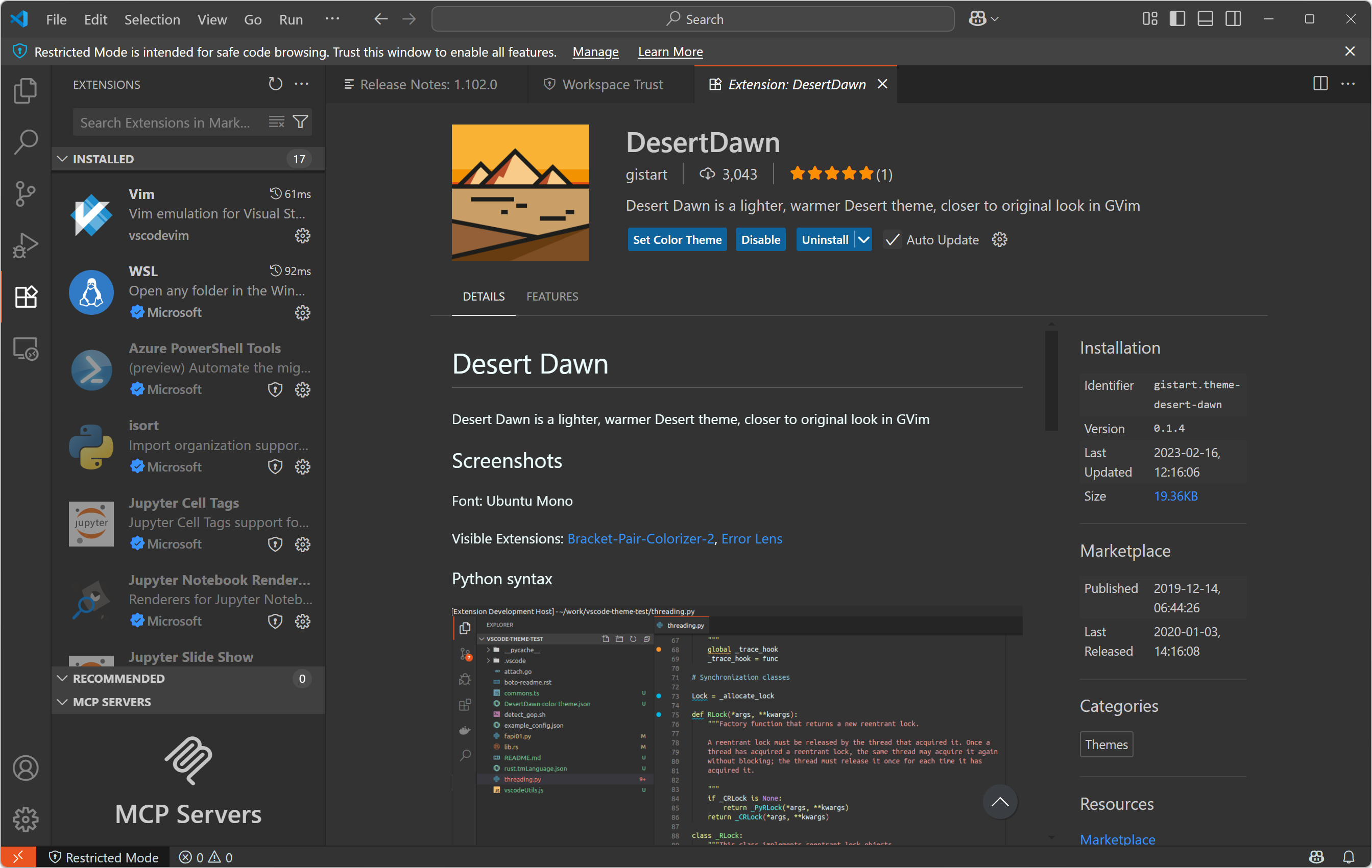 OK, an ask if anyone is up to it. I have been using the Desert Dawn GVim colour scheme for years and years, and it just feels right -- dark but not too dark, and well-defined code element colours. When I switched to using Visual Studio Code for some work, I was happy to find that palette recreated there, and so I use that same basic palette there. This is NOT something I feel up to recreating myself for Calibre, but would love to have. If anyone feels up to recreating it as a Calibre palette, I would be extremely grateful.