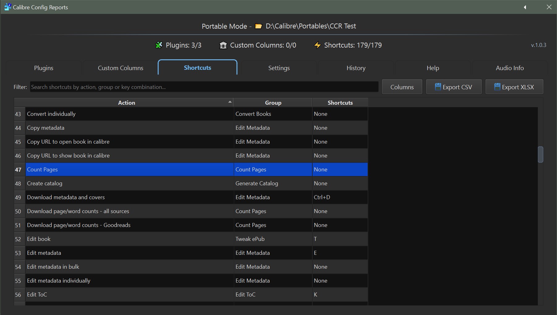 If I set it to None in Custom, it reports as None, of I set to something (e.g. Alt+F2) it's fine, reports as such and it works… The Count Pages and Modify EPUB plugins don't have default shortcuts and they report as None when they're installed, viz: I installed Count Pages and Modify Epub together, i.e. no restart after CP, History only shows the installation of Modify Epub. Whilst perusing the shortcuts list I was reminded of two default shortcuts that clash with long standing Windows shortcuts Alt+Esc - Clear the additional restriction. Windows uses it to switch between windows in the order that they were first opened… and it takes precedence. Ctrl+Esc - Clear the Virtual Library. Windows uses it to pop the Start Menu, and again it takes precedence. IIRC those key sequences were also significant on various Unixy OSs. BR |