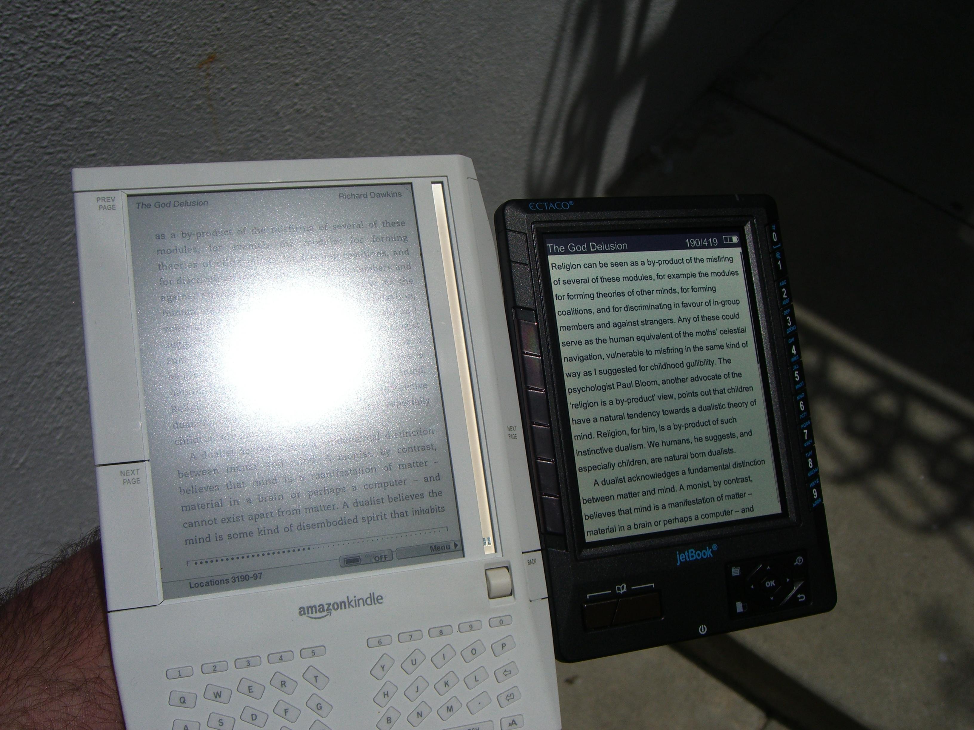 The first with the sun on the Kindle, yes that is THE Sun. Second shot shows the sun on the jetBook, and the third I have angled them so the sun is just off both their screens.