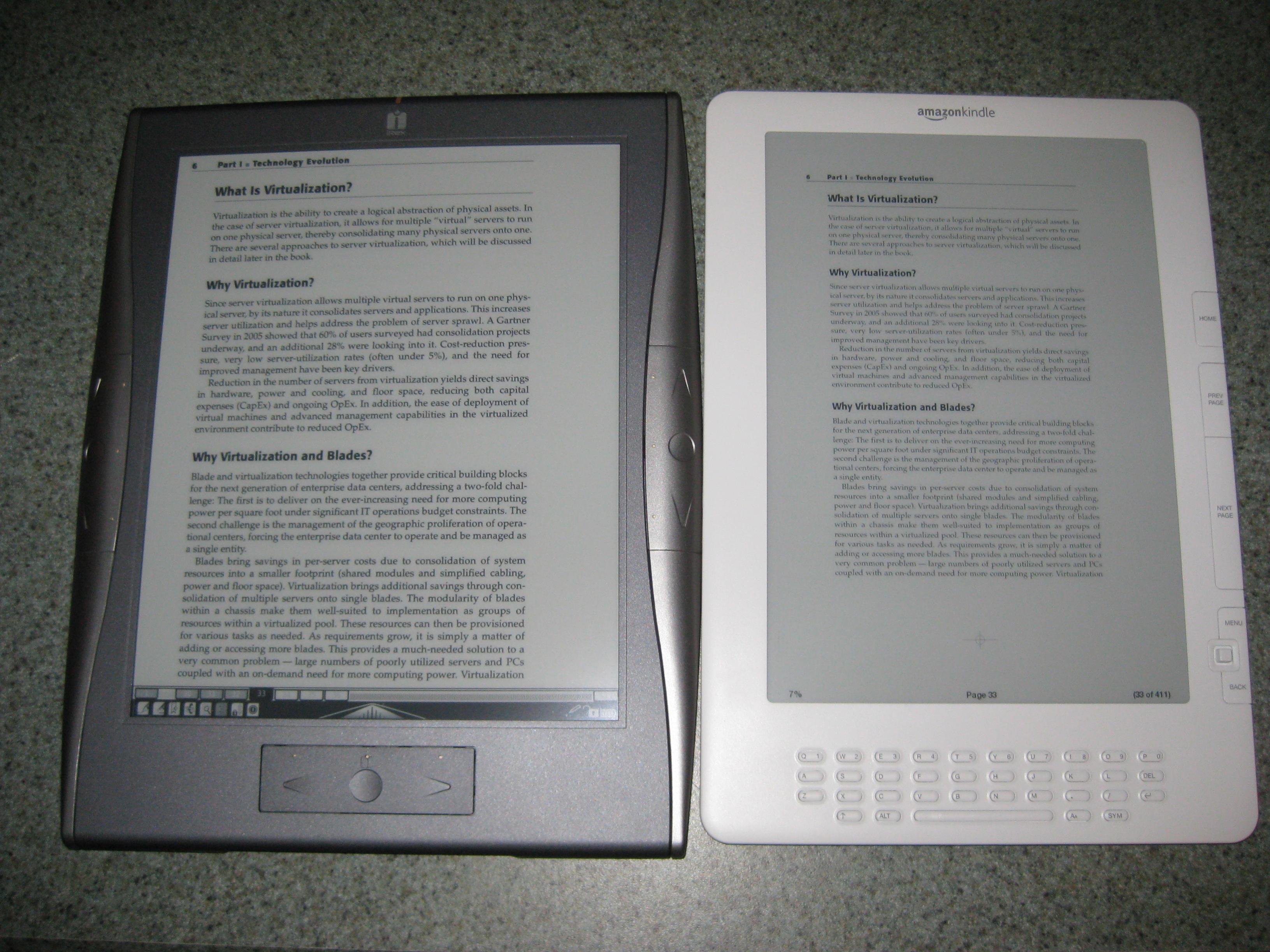I don't care about the 3G or amazon store as I don't buy anything from there. I was hoping the DX would render the pdf's flawlessly, have a slightly smaller screen with much better battery time and a better form factor. The feel of it is nicer than the 1000 because of it's slim size and rectangular The "perfect" reader device for me would be the DX with a black/charcoal bezel, properly displayed pdf's and better document management such as folders. A keyboard isn't necessary for my dream device either, I'd rather have more screen room or a smaller form factor. I would also rather have capacitive buttons as it's quieter and easier for me to use. That's all I can think of off the top of my head. If anyone has ideas for pictures just shoot me some suggestions, I am not a professional photographer so I don't want to disappoint lol I agree with that, I don't know the hardware spec differences for processing power if there is a big difference. Some of the pdf's that rendered perfectly turned pages just as quickly as those with tiny print, at least it seemed like that to me. |