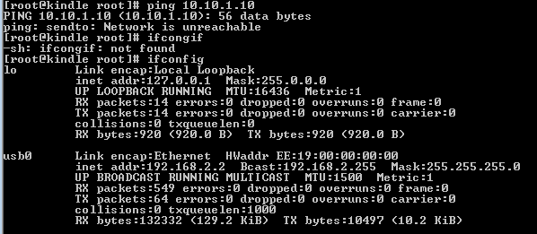 And do you have problem that the telnet always disconnect to kindle after 1-2 minutes? It said: the connection to host lost. And when I turn wireless on, it disconnect after 30second or less. So whatever I did in telnet, I have to do it fast! This is quite annoying! And if I do ifconfig, the result as attachment. Last edited by thanhlp; 11-03-2010 at 01:07 AM. |