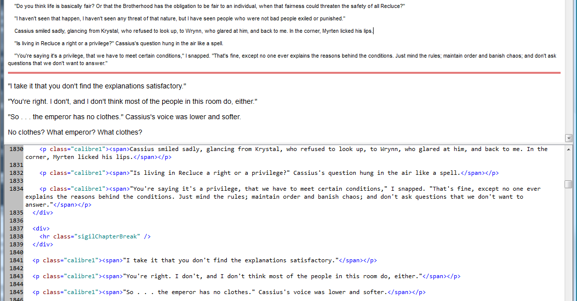 .I'm really happy with the search and replace, which wasn't there before (or I've been blind), especially because it supports regular expressions. I'm having some trouble with them tough, but that seems to be because different flavours of regexps. I run into that with Calibre all the time, too. Anyway, I'll be trying some other regexp testers than the one I currently use because I'm beginning to suspect it differs from most other libraries in its interpretation of the expressions. Something I'm pretty sure there is an issue with is sudden changes of text size. As you can see in the attached screenshot, the text size between to chapters differs though under the hood I can't see anything different. Sorry if this has been brought up before, I couldn't find it on the forums. This is a plain text file that I imported and converted to LRF using Calibre. Since I don't have access to the original text file on this computer, I used Calibre to convert the LRF to HTML which I opend with Sigil. Edit: Something else, when working in the split view, Sigil often crashes when switching between them. Btw, I'm running Vista x64 on an AMD Phenom quadcore something with 3gigs of ram. Last edited by Punksmurf; 11-29-2009 at 04:05 PM. |