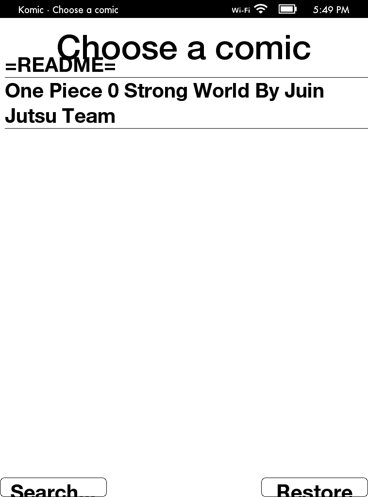 The bad news is that doesn't seem to be extremely stable. Needs to be rebooted every time you close the software if you wanna exec it again. Kual too seems to became unstable after running Komic. When it doesn' start the only information I can read about are: - GATHERING INFORMATION... - COVER VIEW DISABLED - Application Error: The selected application could not be started. Please try again. If your software seems to have a log method but I haven't figured out how to use it. The logfiles in Logs are all empty but Komic_update.txt (But it seems useless) I made a couple of screenshot to show you how it runs (When it does it). I just started working on kindle device but I'll be happy to try to help you with testing. Last edited by Axxx; 01-19-2014 at 12:44 PM. Reason: Uploaded the only shot that could be useful |