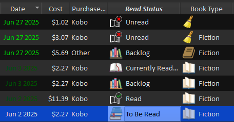 Getting close to finishing the 2024 backlog, too. "Other" is the local pharmacy. They had discounted cozy mysteries in a bin. |