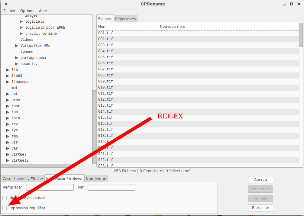 All the well behaved programs present the files in growing order (from 001 to 258). Only gimagereader presents them stubbornly in reverse order... gprename thus presents them normally in growing order and accepts regexes (see screenshot) @KevinH If I import the files in the Calibre editor (did not find a place where they could be accepted in Sigil), even organized in reverse order, they get sorted automatically by growing numbers, 001 on top, 258 down. @Doitsu I did not find any magic button to reverse the order of the files. I contacted the developer who does not reproduce the bug and tells me "If it does not work with the file dialog, you can still use the command line, i.e. $ gimagereader-gtk $(ls -1 *.tif | sort -n)" which I failed to achieve... |