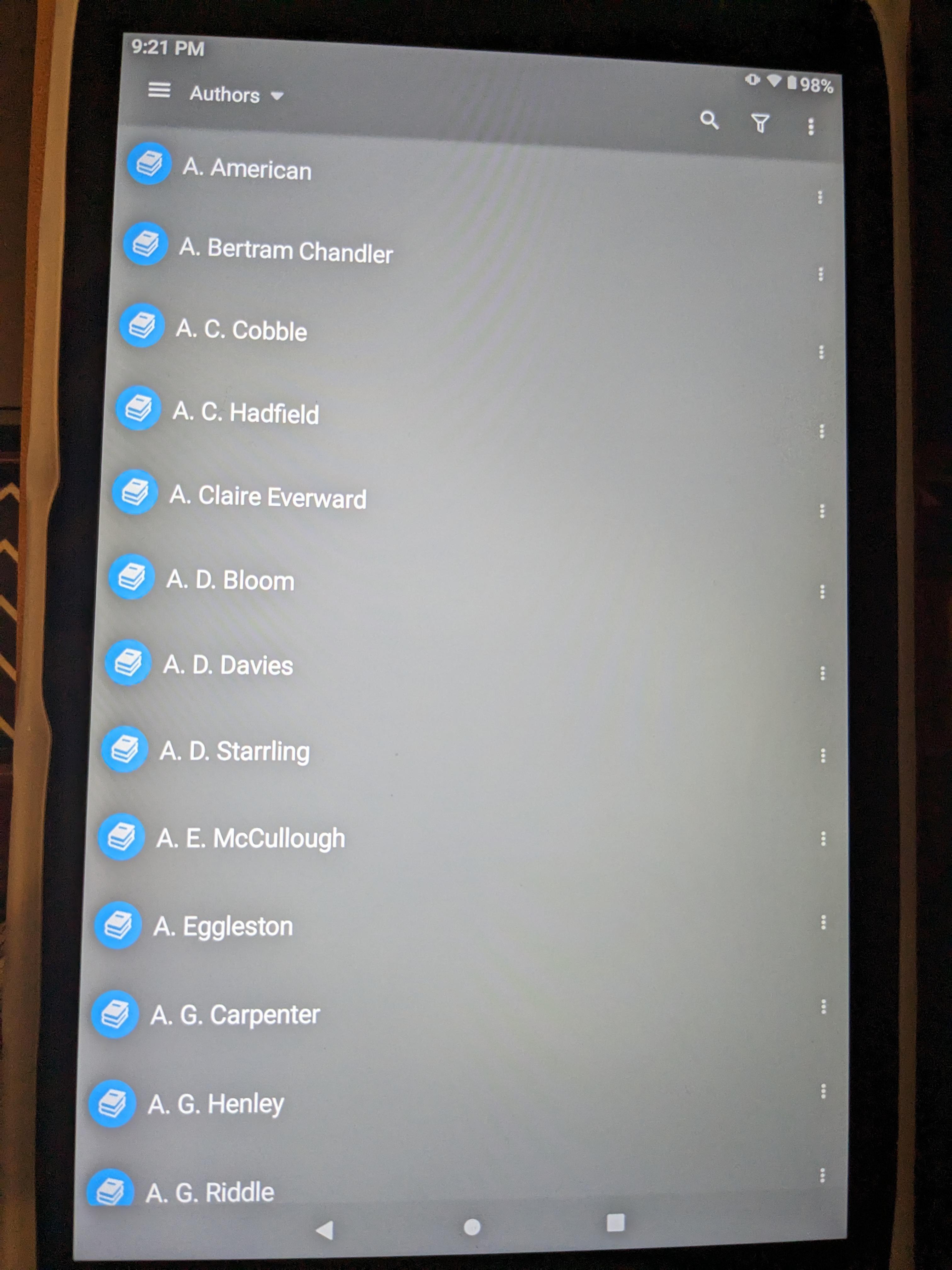 Since reloading Moon+reader pro on my android tablet, the author sort pull down menu is now abbreviated on the screen. There is a way to switch it back to the old way which shows the author list on full screen from a scrolling perspective?