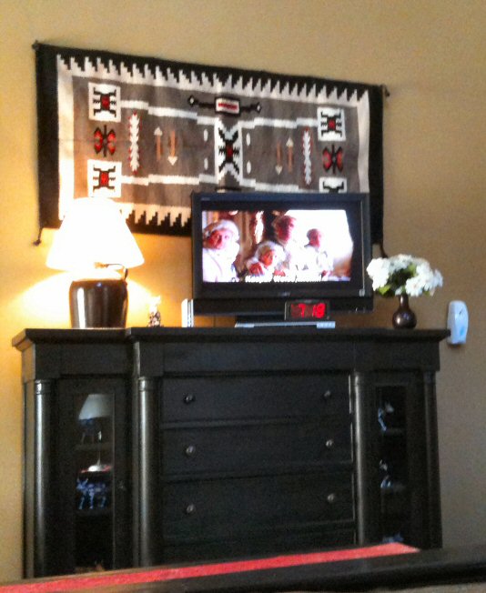 While I was watching the film I was checking out the lamp, which I finished yesterday afternoon. I finally did get the chuck unstuck (I'm back to wearing my splint -- it helped to have my wrist a little more stable). It was so hot out there in the garage. 105-110 I would guess. So, the drill motor kept overheating, and the wood got so hot it actually started charring. All I needed to make was a circle of wood about 1/4 inch thick or so. The mouth on the jug was too big for a bottle adapter, so I needed to make something to wrap around the adapter so it would fit. It took me five tries to get something that would actually work. Then, as luck would have it, the first bulb I put in (new out of the package) was bad, and I kept thinking I had wired it incorrectly. It was just so hot. I am so not doing anything outside today. Oh, photo of lamp attached. That's a scene from "The Red Violin" on the TV. |