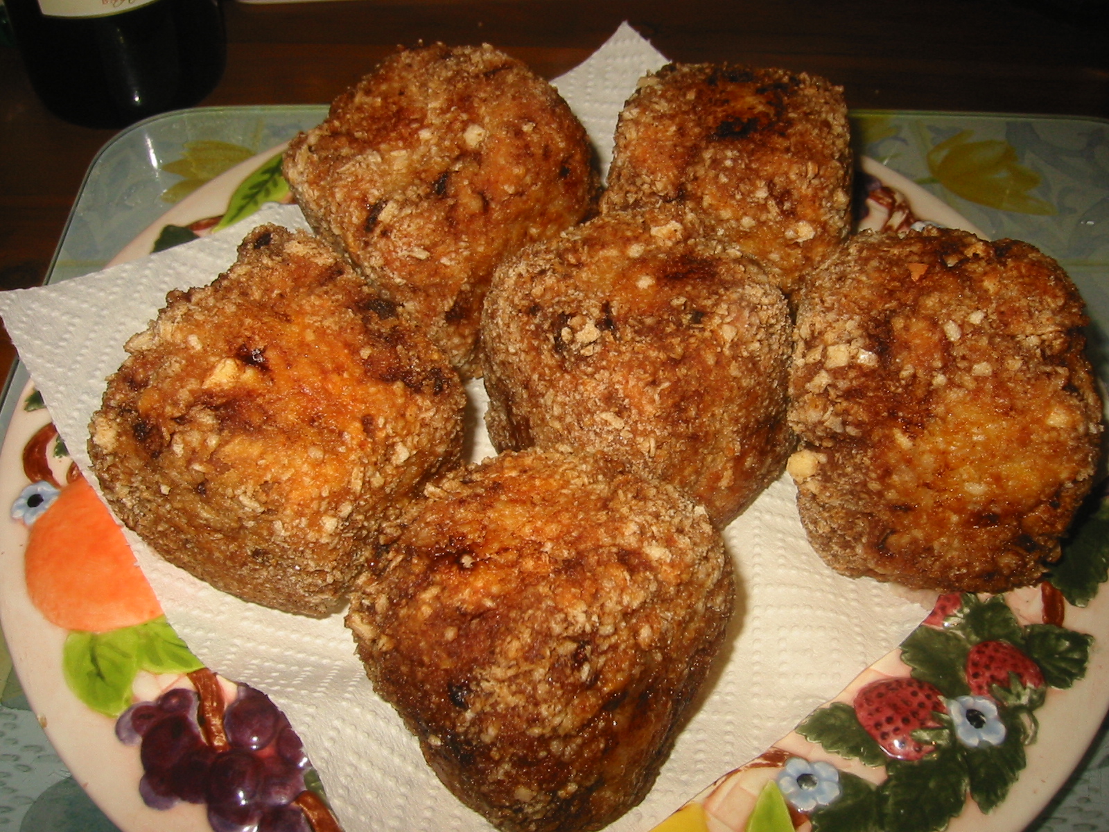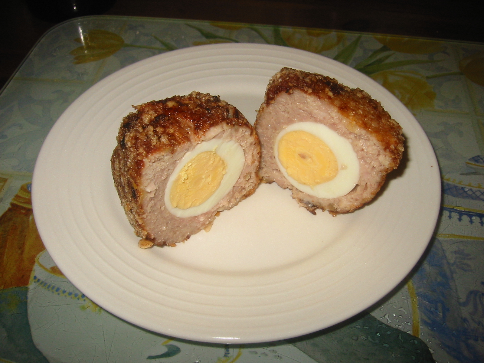 One boilded egg for each scotch egg Skinned gluten free bratwurst sausages Chicken thighs Seasoned to your liking, if the sausages are first class you need not add anything. Maybe some garlic if you love it like I do. Blitzed in the blender/processor (Not the boiled eggs) keep them separate The recipe calls for bread crumbs. So instead I get a packet of tasty rice crackers and put them in a plastic bag and roll them into crumbs with a roller. A bit of bashing helps as well. Even if you can eat gluten (I can, this was for someone else) the crumbs from tasty rice crackers versus plain bread crumbs wins hands down. Take a hand full of blitzed meat and one of the boiled eggs. Cover the egg with the meat. Dip them in whisked egg and roll them in the cracker crumbs. I found that making them cubed rather than spherical was easier to cook in a shallow pan. The shallow pan has extra virgin olive oil in it. There are six sides each. i can fit four in the pan at a time. Sizzle each side. Yum Yum Pigs Bum |