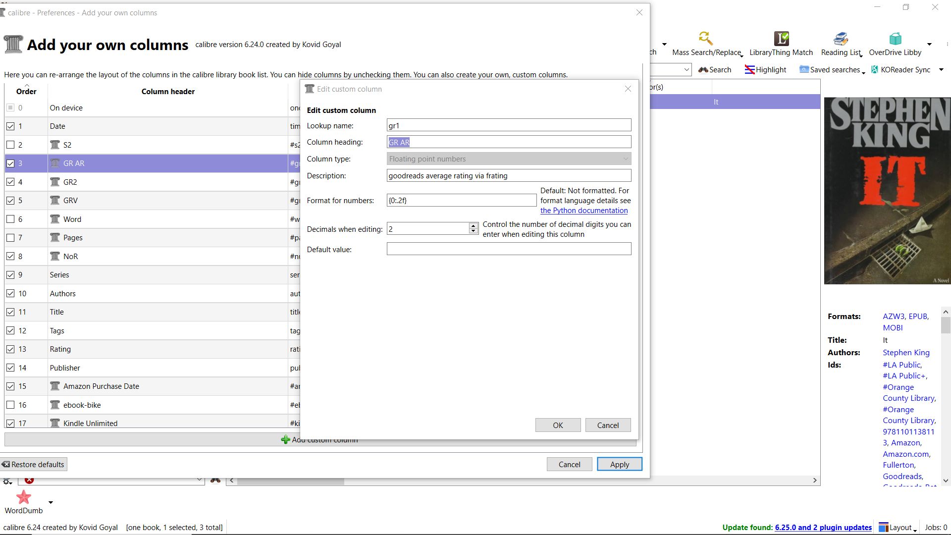 Here is what I do. Sorry it's long, but once it's set up you are good. I have always used the Goodreads Rating plugin with F_rating, but lately I have just used the new Goodreads with the ratings and the number of votes. Since these are recorded as identifiers, you need to create the custom columns for the identifiers, but this is where you can modify it. I attached some pictures to show: Create the columns needed by the new plugin for the average rating and the number of votes as directed. If you haven't already, create a floating intenger column for the average ratings (for me it's the same column that was created with the older plugin {#gr1}) Also create a new "number of votes" column If you haven't already done it, it's a good time to install the "Mass Search and Replace" plugin. Create a new rule for GR Ratings/Votes Create two sets of rules where you copy the column with the identifier for ratings to the column you created with the floating decimal point. Do the same thing for the number of votes Now you need to create an icon rule of some sort to let you know when you have a ratings/votes in a book that isn’t showing up in the new columns you set up. These columns are set up so they automatically follow the decimal point and commas you want. Since you can’t do it with identifiers, and because the column for the identifiers is composite and you can’t change it, what you want is to move those identifiers into the column you created. Now you should have the "Mass Search and Replace" plugin installed. If you do, then create a new set of rules for moving the numbers from the composite columns (the ones filled in by the plugin) to the new ones. Two rules, one for each column. Give it a name like “GR Ratings/Votes” and basically only run it when you know you have the numbers. I also created an icon rule set that lets me know when the plugin added new ratings/votes, but I haven’t yet copied them over. This is nice to let you know when you need to do it Kind of a pain to set up, but once it’s done, it’s pretty autmated and will get those ratings/votes into columns with decimal points and commas. |
