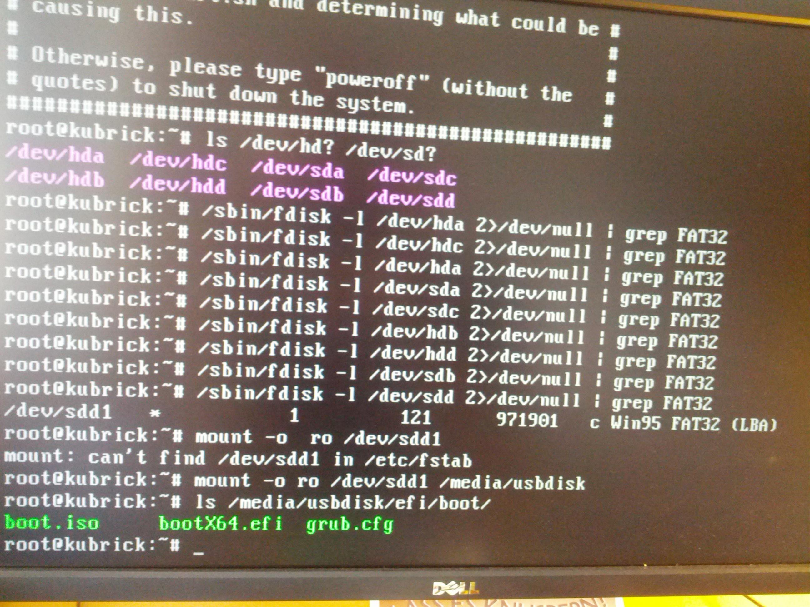 what i did: downloaded the usb base zip, and flashed the image with the win32 flasher. then i downloaded the K4 iso and copied it to the efi/boot folder. when i boot from the usb stick, i'm getting "no usable kubrick partition found" (first attached image). so i tried to debug it a bit and did the steps in the script manually (second attached image), but from doing that i can't identify the problem. does anyone have an idea? edit: i did the steps in https://bitbucket.org/ixtab/kubrick/...t=master#cl-48 Last edited by kayron; 09-07-2014 at 09:07 AM. |