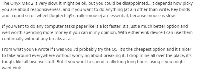 -Onyx Boox products are bad as monitors. Really bad lag, especially bad mouse lag. -Dasung is the way to go. I'd really appreciate an honest assesment of somebody who has used the Onyx as a monitor as this is a big purchase. How would you compare the two products ? Is the Onyx just as good ? I would love for the Onyx to be just as good because it's not just a monitor but a full tablet. Then there's the Hisense Q5. Not E-ink but RLC with a super fast refresh rate but lower readability than E-ink. |