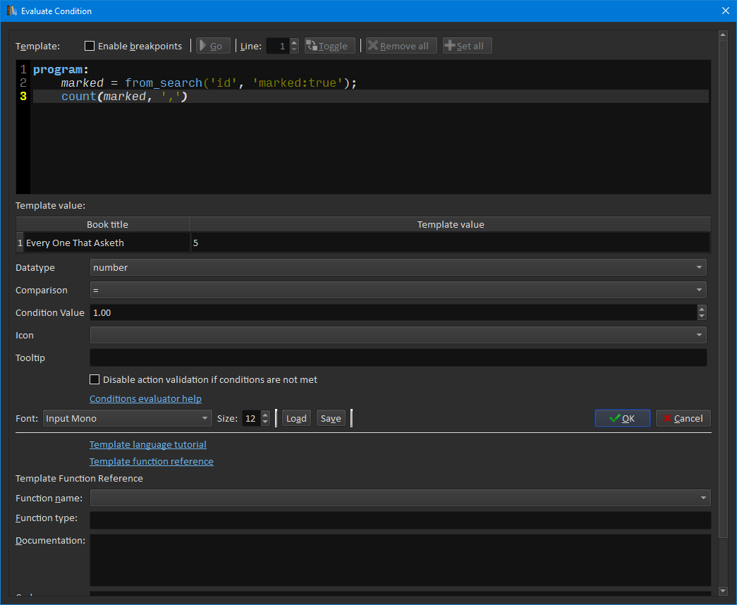 To summarize; from_search() pulls data from multiple books, so it can potentially take up several minutes depending on the size of library and nature of the query. While in template dialog, you cannot allow this to happen, because the template gets re-evaluated with every letter typed, so it can completely freeze the dialog. As a solution to the above, when in template dialog, from_search() always returns a fixed list of five items (e.g. '1,2,3,4,5') no matter the query being given to it. Edit: Even though it returns a fixed list, it still verifies the arguments (field_name and search_string), and will return an error if it finds a problem with either. Edit2: The items of the list and the separator are changed based on the field_name. Last edited by capink; 09-30-2021 at 08:42 PM. |