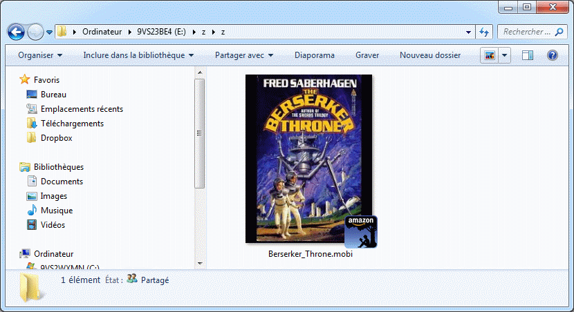 here's an example in baen free books, it's free, just download the one marked 'Mobi/Palm/Kindle Format'. Berserker Throne by Fred Saberhagen Last edited by alansplace; 05-27-2011 at 01:40 PM. Reason: fix error |