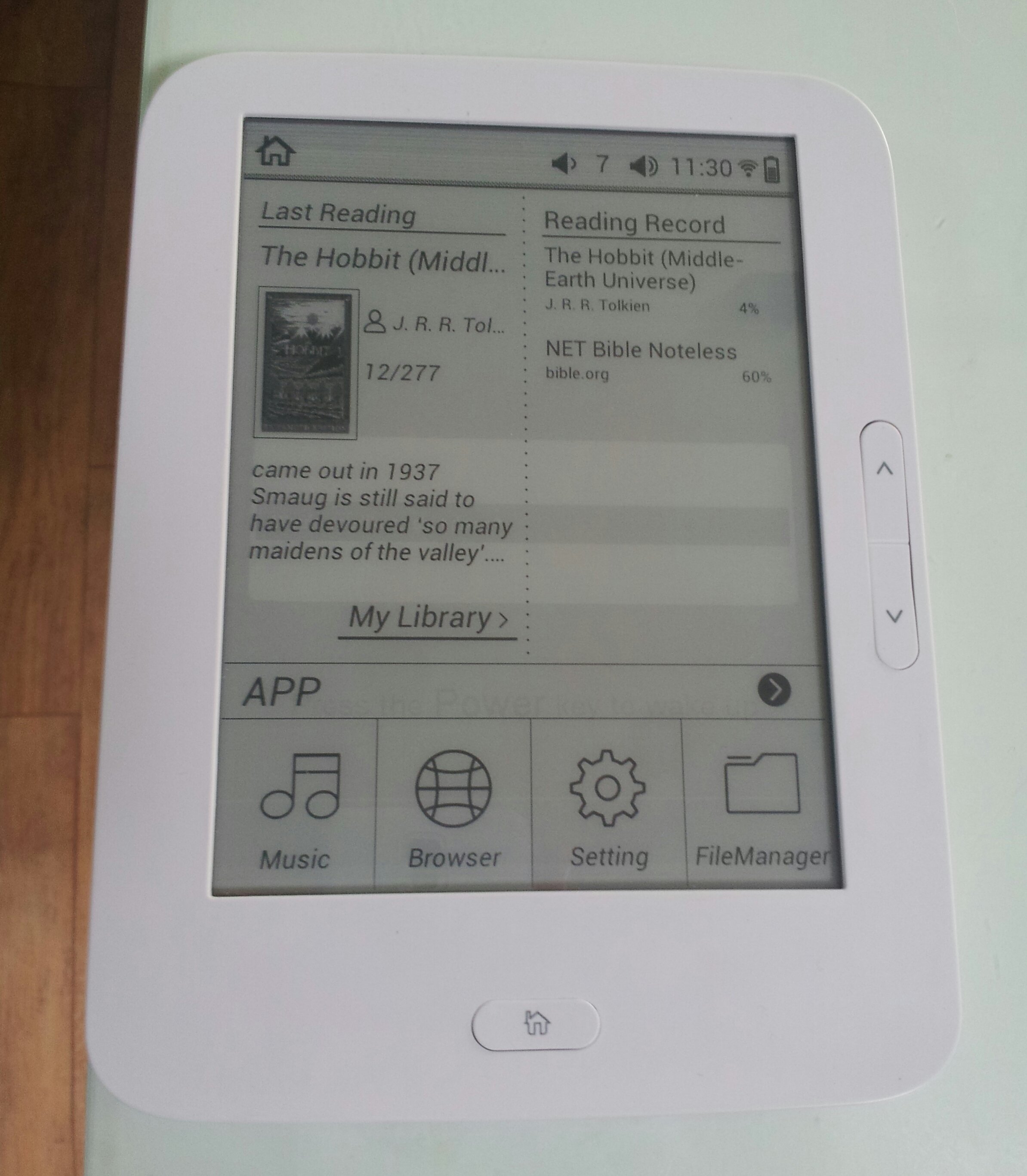 I tried to instal .apk files with the file manager that the device came with but no luck. It simply says "invalid file." Moreover, there is no setting for "non-market apps" like there is on my android phone. I looked around on the internet last night but not really sure about how else to install apk files. If anyone has some suggestions, I'd like to hear them. The inbuilt reading app not only has Chinese menus, it is clunky and has none of the functions found in the Onyx software. The only advantage of android is for third-party apps. The fact that there's no obvious way to put third-party apps on here is just a waste, in my opnion. Here's a couple pictures. The back is a rough feeling metal finish. Because of this metal, the USB connection port scraps a little and thus makes my skin crawl whenever I insert a cable, ha ha, but otherwise the device itself seems okay. The glare on the screen, however, is a major problem. If I could install android apps such as Kindle or Google Books, I could live with the screen (it is still better than a tablet LCD) but as it is, the Onyx screen looks better and has way better software. Oh, and I checked out cloud reading but it said that the device's browser is not compatible. Like I said above, an interesting little device. It is fast but without third market apps it is useless. |