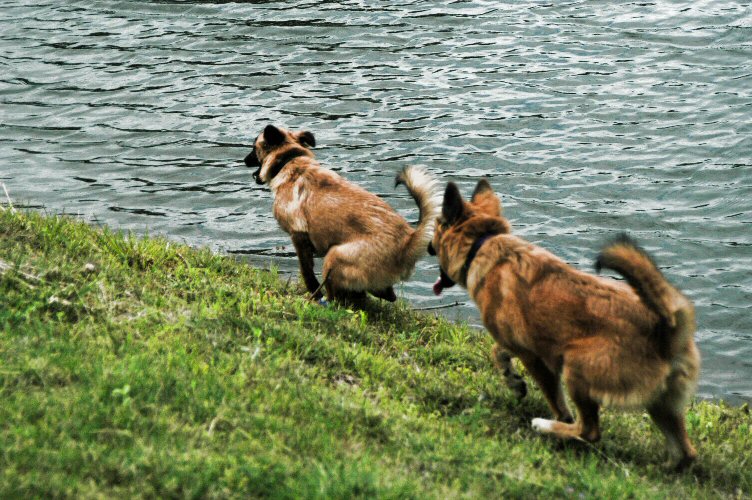 One of the girls is a fine swimmer, the other just likes to wade in the water. That day, the weather was probably 100+ and they were more interested in having a drink than anything else. They have been known to be much less serious ... and are simply beautiful dogs .... see attached. I absolutely love them. Today, the groomer came to give them their baths and their summer trims. They just about go out of their minds with happiness when she comes. They love people in general, but they practically drag me to the grooming van when it arrives.