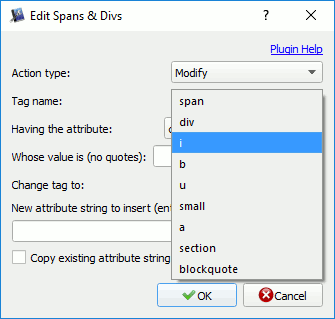 I was working on a book where I wanted to flip nested <strong> -> <b> + <em> -> <i>. Currently in the "Tag Name" dropdown, you can only choose <b> or <i> as an input. Would be nice to have <strong> and <em> added to that dropdown as well: Last edited by Tex2002ans; 01-10-2017 at 03:25 AM. |
