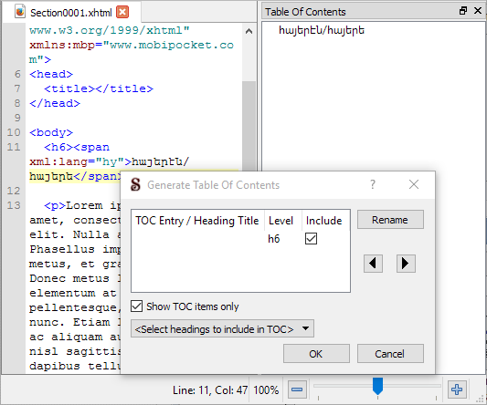 @DiapDealer: I was able to reproduce this bug with Sigil 0.8.9 on my Windows 10 machine. It appears to be caused by the span tags around the TOC entry. Without them, the Armenian text is displayed fine.