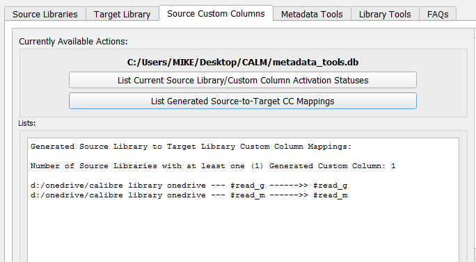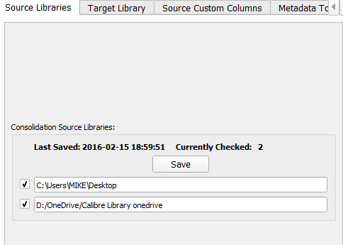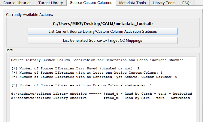 By the way, in Windows, the "Desktop" folder is a very special folder. I would not recommend using it as a Calibre library itself. You need to use Calibre to create a 'real' Calibre Library using its proper menu path for doing so: Right Click the Library Icon> Switch/Create Library > Choose the parent directory which must already exist, and go from there. Example: "C:\Users\Mike\Documents\eBooks\MyLibraryName" . Then, switch to that new Library and test it. Add a book to it, and check its functionality. Click the CALM icon. Refresh the Target Library. Change the Source Libraries to what they should now be, and that does not include C:/Users/MIKE/Desktop . Generate the Source Custom Columns. Then, run the Consolidation. Note that you can Consolidate a particular Source Library only once for any single incarnation of the CALM Target Library, but that does not mean that you have to Consolidate all of the Source Libraries at once. The checkboxes on the Source Library Tab control which to consolidate at any particular time. The ToolTips say that too. You could try Consolidating only the OneDrive library to see what happens. Based on your attachments, it should work fine. If it does not, apply the Nuclear Option again, and start over from scratch again but using "C:\Users\Mike\Documents\eBooks\MyLibraryName" instead of "C:/Users/MIKE/Desktop/metadata.db". The reason that only one (1) of your Source Libraries was "Generated" is that you have only one (1) Source Library with any Custom Columns whatsoever. In summary, the problem is not CALM, but C:/Users/MIKE/Desktop/metadata.db. Good luck. DaltonST Edit: I just noticed that your CALM DB path is C:/Users/MIKE/Desktop/CALM/metadata.db . The erroneous Source Library is C:/Users/MIKE/Desktop/metadata.db . That means that your CALM Target Library is a "child" of your Source Library! That is not ever going to work as far as CALM is concerned. Your CALM Target Library path should be something like: "C:\Users\Mike\Documents\eBooks\CALM\metadata. db" Last edited by DaltonST; 02-15-2016 at 05:47 PM. Reason: Your CALM Target Library is a "child" of your Source Library |