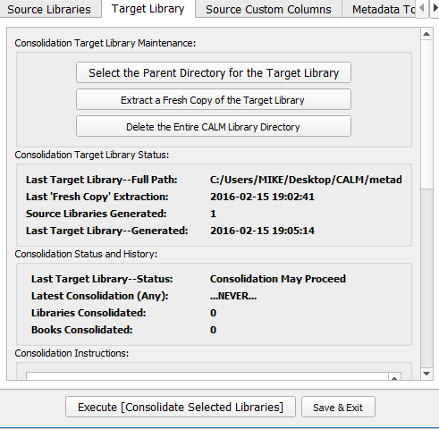 You need to start over from the beginning. Read and follow the instructions embedded in the Target Library Tab. You should first "Refresh" the Target Library. Then, specify the Source Libraries, which are your "real" Calibre libraries that have real books in them. Be sure to "save". Then, you must "Generate" your Source Custom Columns. You have never used the word "Generate", so I suspect you have not done so. It is required. Read the ToolTips on that Tab. After a successful Generation, you click the "Execute Consolidation" pushbutton on the Target Library Tab. Nuclear Option: If the above does not work, delete this file: C:\Users\Beltonmike\AppData\Roaming\calibre\plugin s\Consolidate All Library Metadata.json which is the configuration file that has been saved as a result of everything you have done so far. Then, manually delete the CALM target library (everything, including /CALM/ itself). Then start over from scratch. If you still have problems, you must attach to your next post "Screen Snips" (using the Windows 10 "Snipping Tool" located at "C:\WINDOWS\system32\SnippingTool.exe") of the first 3 Tabs. Also, attach the entire Job Log from the Consolidation Job after you copy it into a Notepad text file. DaltonST |