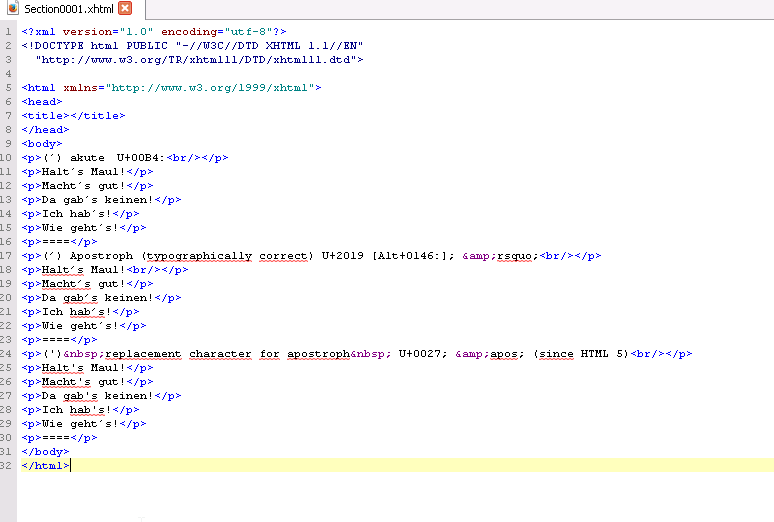 You can hover with the mouse over the keys. https://de.wikipedia.org/wiki/Tastat...C3.96sterreich At the left side of the backspace key you can see (`) Gravis (´) Akute (’) The (typographically correct) Apostroph is not accessible with a key, you have to type ALT+0146 (see https://de.wikipedia.org/wiki/Apostr...afisch_korrekt) At the left side of the return key (together with #): (') Apostroph (typographically incorrect/replacement character) (https://de.wikipedia.org/wiki/Apostr...rafisch_falsch) So a typically German (like me) takes this (') (typographically incorrect) Apostroph or (´) Akute (which is wrong) The Gernan Duden (Dictionary of the German language) uses the (typographically incorrect) (') Apostroph in the article about Apostroph: http://www.duden.de/sprachwissen/rec...geln/apostroph So i checked this with the only spellchecker of Duden: Duden | Rechtschreibprüfung Online Betaversion http://www.duden.de/rechtschreibpruefung-online (´) akute U+00B4: Halt´s Maul! Macht´s gut! Da gab´s keinen! Ich hab´s! Wie geht´s! (’) Apostroph (typographically correct) U+2019 [Alt+0146:]; ’ Halt’s Maul! Macht’s gut! Da gab’s keinen! Ich hab’s! Wie geht’s! (') replacement character for apostroph U+0027; ' (since HTML 5) Halt's Maul! Macht's gut! Da gab's keinen! Ich hab's! Wie geht's! As you can see the text is correct using the acute symbol and using a real apostrophe gives a misspelled word: So they do it wrong! I checked this again with Sigil and the German Hunspell dictionary. It does the same mistake. Additional I used the HTML-Entities ' ’ but they are converted to the real characters during saving. This is the new version of the testcase epub: https://www.mobileread.com/forums/at...1&d=1485176688 What can i do to make the differences between the acute and the tweo versions of apostroph visible in the book views of Sigil? Last edited by AnselmD; 01-23-2017 at 08:17 AM. |