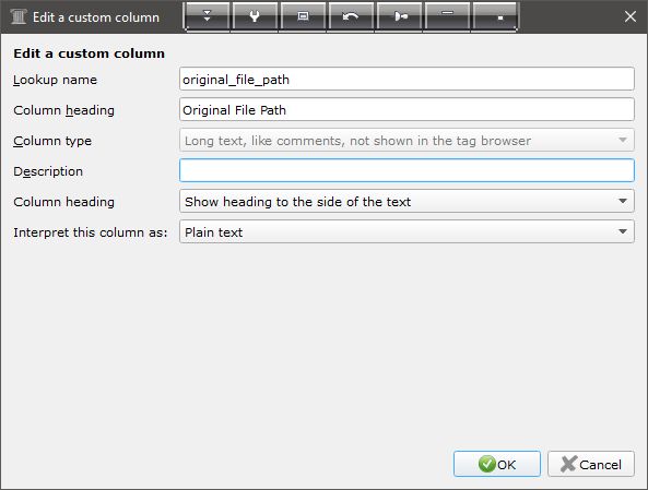 Hmmm - just discovered this plugin appears to have stopped working in December. The date/Date column values in the books where the file path is missing indicate that it stopped working when I installed version 0.0.7.   I don't normally display the column in the book list or the book details panel, if I want to see it (rarely) I use the 'press 'I'' variant of book details. Shortly after installing version 0.0.8, I had occasion to press 'I' on a book I'd just added to check another column I don't display elsewhere. This is when I noticed the Original File Path column wasn't there. I might have noticed sooner if the press 'I' window had an option to display empty values, which I would set in a heartbeat. Screen shots of column definition and plugin configuration are attached. Aside : The inability to see empty values in the 'press I' variant of Book Details is akin to not being able to look in your wallet/purse/pocketbook if its empty. BR |