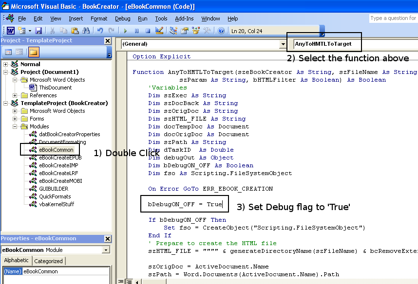 Check you path make sure you have the paths on BookCreator pointing to the correct location of Calibre. NOTE TO BOTH POSTERS: Please enable the debug output. This is the command sent out to calbire to create the eBook. Steps 1) Open the Word document you wish to convert to an eBook in Bookup a BC new file in MS Word 2) Depress the Alt+F11 button. 3) Follow the steps in the image attached 4) Create the eBook (LRF/ePUB) 5) In the specified directory there should be a debug.txt file // Post the file here and/or run the output in the debug.txt from a command line 5) Start|run... =X= |