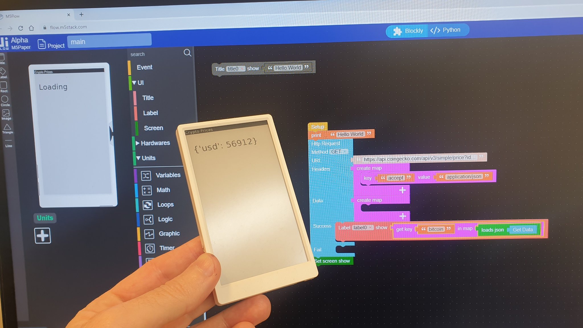 How easy it is to read a JSON REST API and display it on the M5Paper with UIFlow (not my project, from https://twitter.com/simonvc/status/1363249199689715726)