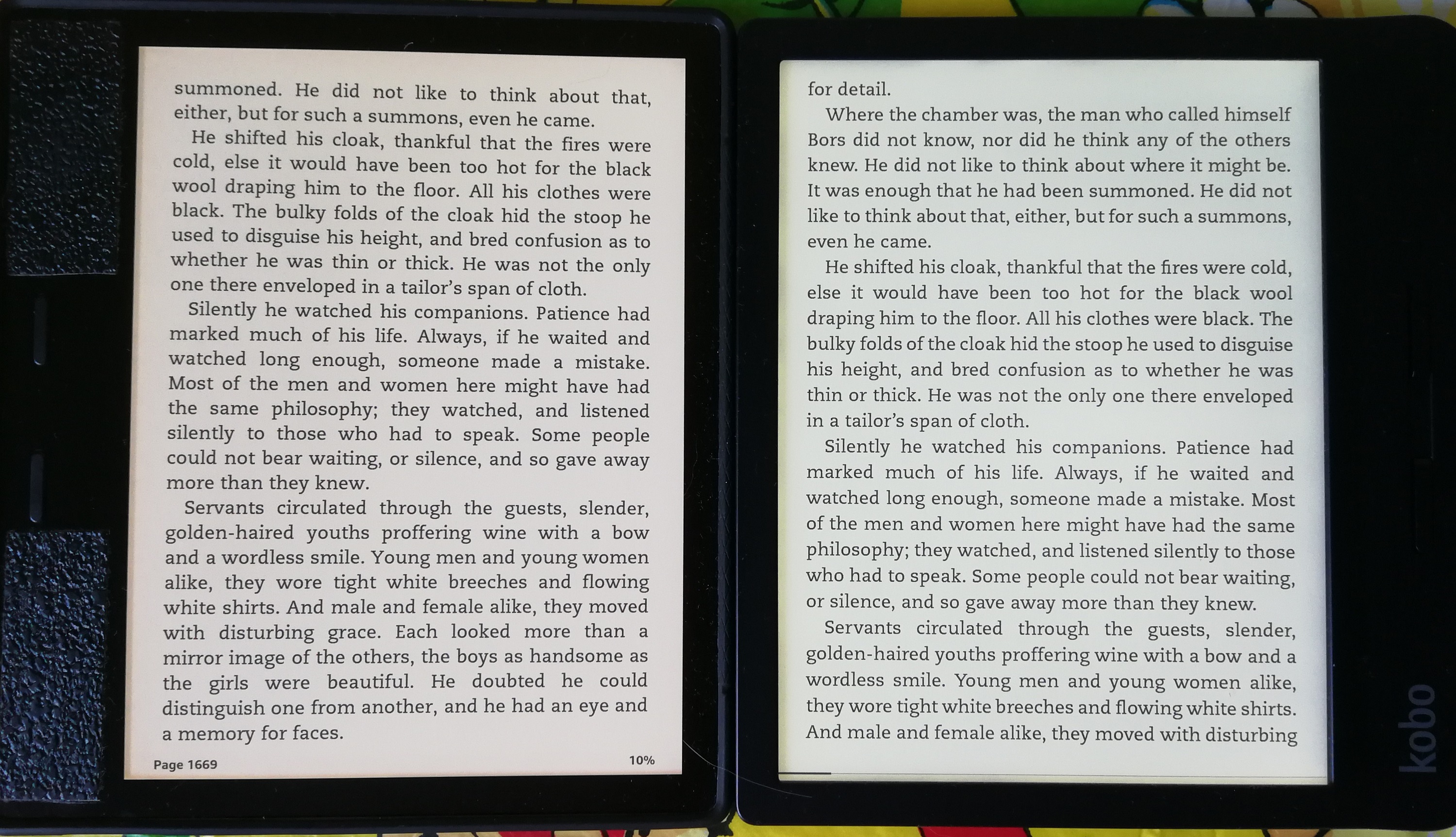 I took some pictures with my phone (I have no dedicated camera). The frontlight is more or less on the same level. No warm light. The font is Caecilia, with no weight added (with other fonts the difference in contrast was even bigger). The books are sideloaded from Calibre in azw3 and epub (The Wheel of Time is kepub). I have not modified the photos in any other way than rotated, straightened and cropped.
