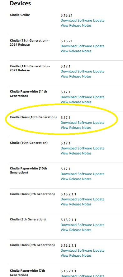 I included a screen capture of the download page from Amazon.com showing this. So I am saying the Oasis 3 still gets 5.17.1 (which downloaded when I clicked on the link). I deleted that download but re-downloaded it and attached a screenshot of what the file looks like in my Downloads directory. So I can state with a very high level of confidence that the Oasis 3 firmware update is still 5.17.1. I've also attached a screenshot of the Amazon download page zoomed out to show more versions and the Oasis 3/10th gen circled. Last edited by DNSB; 11-05-2024 at 09:32 PM. |