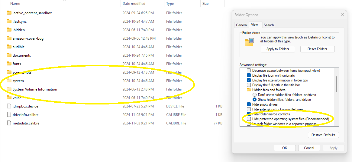 $ pwd ~/mnt/kindle/Internal Storage $ ls -a1 ./ ../ .active_content_sandbox/ audible/ documents/ driveinfo.calibre fonts/ metadata.calibre screenshots/ $ cd system cd: The directory 'system' does not exist $ touch system touch: cannot touch 'system': Input/output error $ touch systema # Works! |