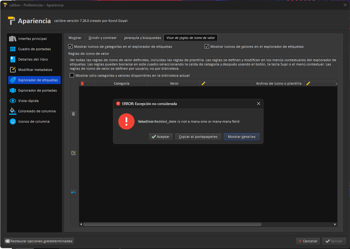 ![]() ![]() ![]() calibre, version 7.26.0 ERROR: Excepción no considerada: <b>ValueError</b>:#added_date is not a many-one or many-many field calibre 7.26 embedded-python: True Windows-10-10.0.27788-SP0 Windows ('64bit', 'WindowsPE') ('Windows', '10', '10.0.27788') Python 3.11.5 Windows: ('10', '10.0.27788', 'SP0', 'Multiprocessor Free') Interface language: es EXE path: C:\Program Files\Calibre2\calibre.exe Successfully initialized third party plugins: DeACSM (0, 0, 16) && Gather KFX-ZIP (from KFX Input) (2, 19, 0) && Package KFX (from KFX Input) (2, 19, 0) && Action Chains (1, 20, 8) && Amazon.com Multiple Countries (1, 0, 0) && Anna's Archive (0, 2, 4) && Apple Books covers (0, 2, 0) && Barnes & Noble (1, 5, 6) && Count Pages (1, 13, 6) && Drop Search Results (1, 0, 14) && Ebook Translator (2, 3, 5) && Editor Chains (1, 1, 9) && EpubMerge (3, 2, 0) && EpubSplit (3, 10, 0) && FanFicFare (4, 42, 0) && Fantastic Fiction (1, 7, 1) && Fantastic Fiction Adults (1, 3, 1) && Favourites Menu (1, 3, 1) && FictionDB (1, 4, 2) && Goodreads (1, 8, 2) && Goodreads Sync (1, 16, 11) && Hardcover (0, 2, 2) && K2pdfopt Plugin (0, 5, 5) && KFX metadata reader (from KFX Input) (2, 19, 0) && From KFX (2, 19, 0) && KFX Input (2, 19, 0) && Set KFX metadata (from KFX Output) (2, 13, 0) && KFX Output (2, 13, 0) && Kindle hi-res covers (0, 5, 1) && Libgen Fiction (0, 4, 0) && Mass Search-Replace (1, 8, 2) && PDF Cover (0, 1, 0) && Quality Check (1, 13, 16) && Reading Goal (1, 8, 5) && Reading List (1, 15, 4) && Search The Internet (1, 11, 3) && SmartEject (2, 6, 0) && WordDumb (3, 33, 1) && X-Ray Creator (3, 2, 1) Traceback (most recent call last): File "calibre\db\cache.py", line 917, in all_field_names AttributeError: 'CompositeTable' object has no attribute 'id_map' During handling of the above exception, another exception occurred: Traceback (most recent call last): File "calibre\gui2\preferences\__init__.py", line 378, in showEvent File "calibre\gui2\preferences\look_feel_tabs\tb_icon_r ules.py", line 431, in lazy_initialize File "calibre\gui2\preferences\look_feel_tabs\tb_icon_r ules.py", line 452, in populate_content File "calibre\db\cache.py", line 85, in call_func_with_lock File "calibre\db\cache.py", line 919, in all_field_names ValueError: #added_date is not a many-one or many-many field |