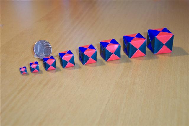 ). She has also made some beautiful dolls (with a porcelain face, hand made).I never liked working with a needle and thread. I'm more a paper fan. Origami in particular. The first is a line of cubes, made by squares ranging from 1cm to 4,5cm. The second is a close up shot of the smallest unit. The coin is a 1 euro cent. The third is a nice overview of some things I've made