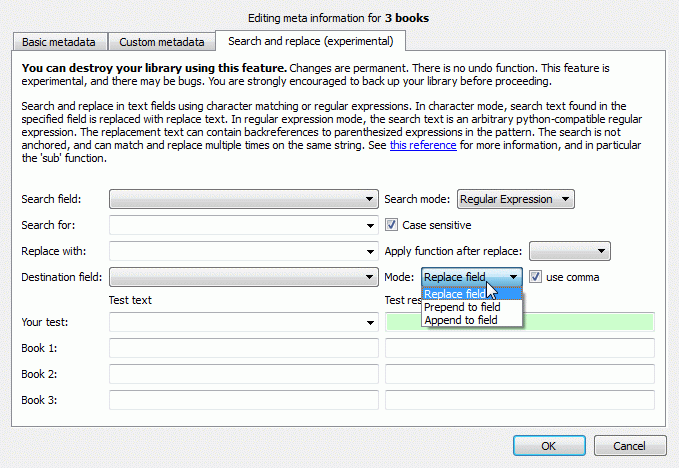 In any event, you get one source field and one destination field. Both must be text type. It sounds like you want two source fields, series and series_index? Or perhaps even three: title, series, and series index? This was what the 'input template' was for. As noted above, I didn't end up building that because of problems with multiple-value columns (tags, for example). The tags source field is not the same as a template containing {tags}. In the tags==source case, the expression is applied on a tag-by-tag basis. In the template case, the expression would be applied once across the entire set of tags. It it hard to explain the two different behaviors.