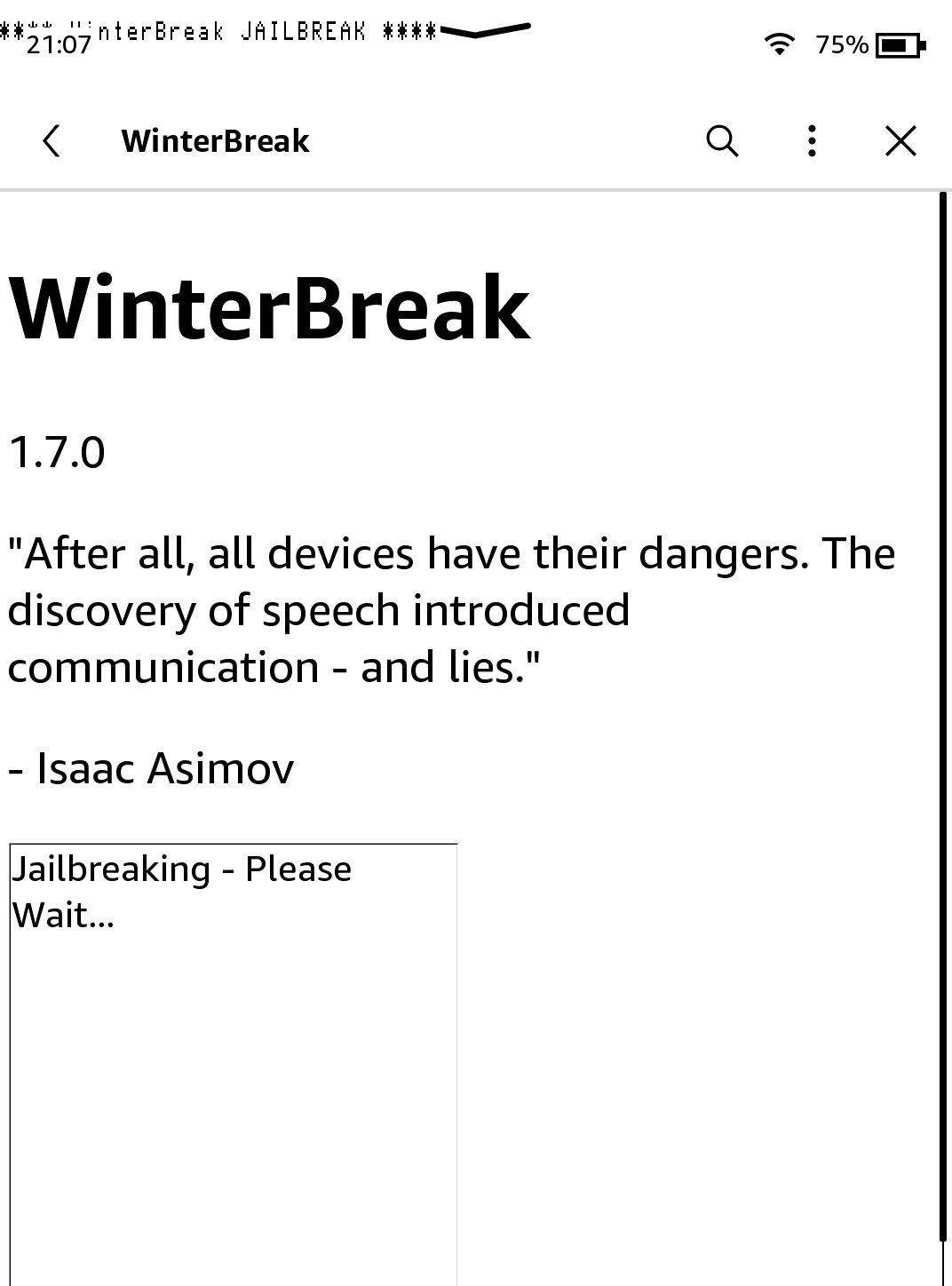 Kindle Model - Paperwhite 10th Generation Firmware version - Kindle 5.16.3 I am following the Winterbreak guide on the Kindle Modding Wiki. I downloaded the latest Winterbreak release from the website. Put kindle in airplane mode. Restarted the kindle. Copied all the files and folders including the .active_content_sandbox folder. Clicked on the Store icon, turned off the airplane mode after the prompt. Automatically connected to an active internet connection. The Mesquito Launcher opened successfully. Clicked on the WinterBreak icon. I can see the first line as follows when WinterBreak attempts to jailbreak, **** WinterBreak JAILBREAK **** After this there is no progress even if I leave my kindle for around 10 minutes. Fearing the automatic updates, I do not let the internet connection run for over 10 minutes. I have done this 7 times. Am I missing something? I have attached the screenshots of the WinterBreak Jailbreaking process (7th attempt). On my fifth attempt I tried to install the hotfix anyways thinking that the jailbreak was successful, but there was an error and I had to reboot the device. Do I have to manually update the device to 5.17 and try again? Or should I try to do this process some more times as suggested on some reddit threads. After the 6th attempt I removed the temp update file that was downloaded and filled the internal storage leaving only 17MB of free internal storage to prevent download of automatic updates. Even then there was no progress. Can someone guide me as to what should be my next step. |