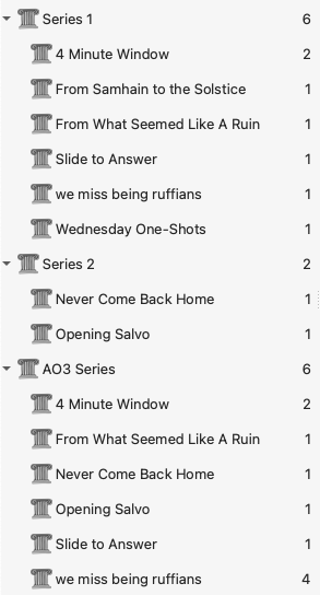 But now I'm perplexed by what is happening with my "we miss being ruffians" series data. I have both an anthology (marked 0 in the series) and three works in the series (marked 1, 2, 3). But this is how things look in the tag browser for my series. It shows just 1 work under "Series 1" but all four of them under my AO3 Series column. This isn't actually a problem for me given I intend to hide the Series 1, Series 2, Series 3 categories in the tag browser and just keep calibre's default series category/column and my AO3 series column. But it's weird, isn't it? See attached. |