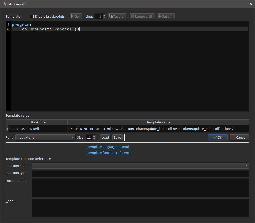 calibre, version 5.33.2 ERROR: Template Error: Running the template: program: columnupdate_kobocoll() returned an error: Formatter: Unknown function columnupdate_kobocoll near 'columnupdate_kobocoll' on line 1 |