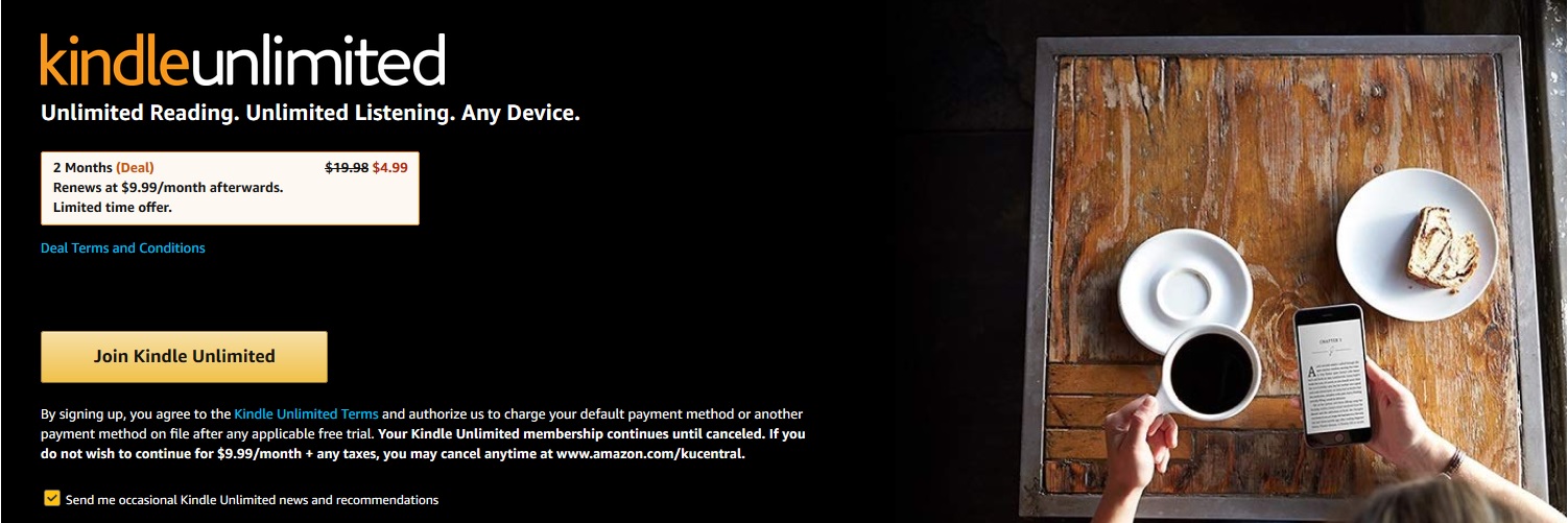 I went to the main Kindle Unlimited page and saw an offer for 2 months of KU for $4.99. This offer may be targeted and I assume only shows up if you're not eligible for a free trial. At first I was unsure, but now I read it to mean $5 for both months, not $5 per month for 2 months since it also shows $19.98 ($19.98 struck-through), which is 2 months at the normal $9.99 per month. Here's the page where I saw the offer (I was already logged in to Amazon): https://www.amazon.com/kindle-dbs/hz...alEnabled=true |