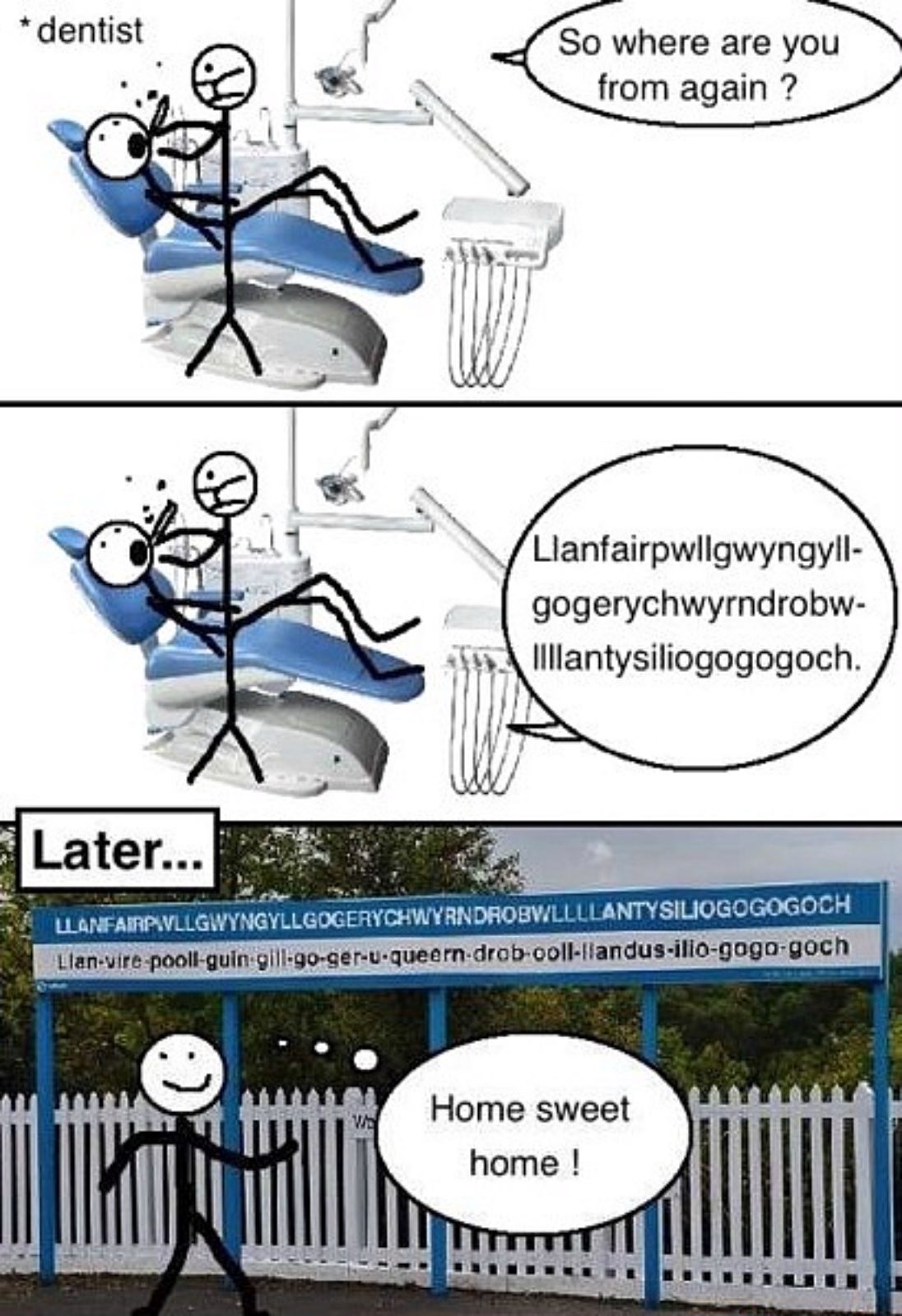 Phonetically: Llan-vire-pooll-guin-gill-go-ger-u-queern-drob-ooll-llandus-ilio-gogo-goch ![]() ¹ It apparently translates as « The Church of St Mary in the hollow of the white hazel near the rapid whirlpool and the church of St Tysilio near a red cave. » ² And I was brave enough to type it in Google Maps since I am not hippopotomonstrosesquipedaliophobiac Last edited by PoP; 08-16-2014 at 04:44 PM. |