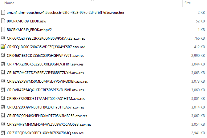 So, KFX conversion fail. I installed K4PC 2.4.70904 on my wife's Windows 10 laptop and blocked the updates. I downloaded one of the books in my library, stuck it on a thumb drive, and plugged it into my Linux laptop. I have the alpha release of NoDRM, the current KFX Input plugin, and calibre 8.2.1. A screenshot of the files that K4PC downloaded is attached.