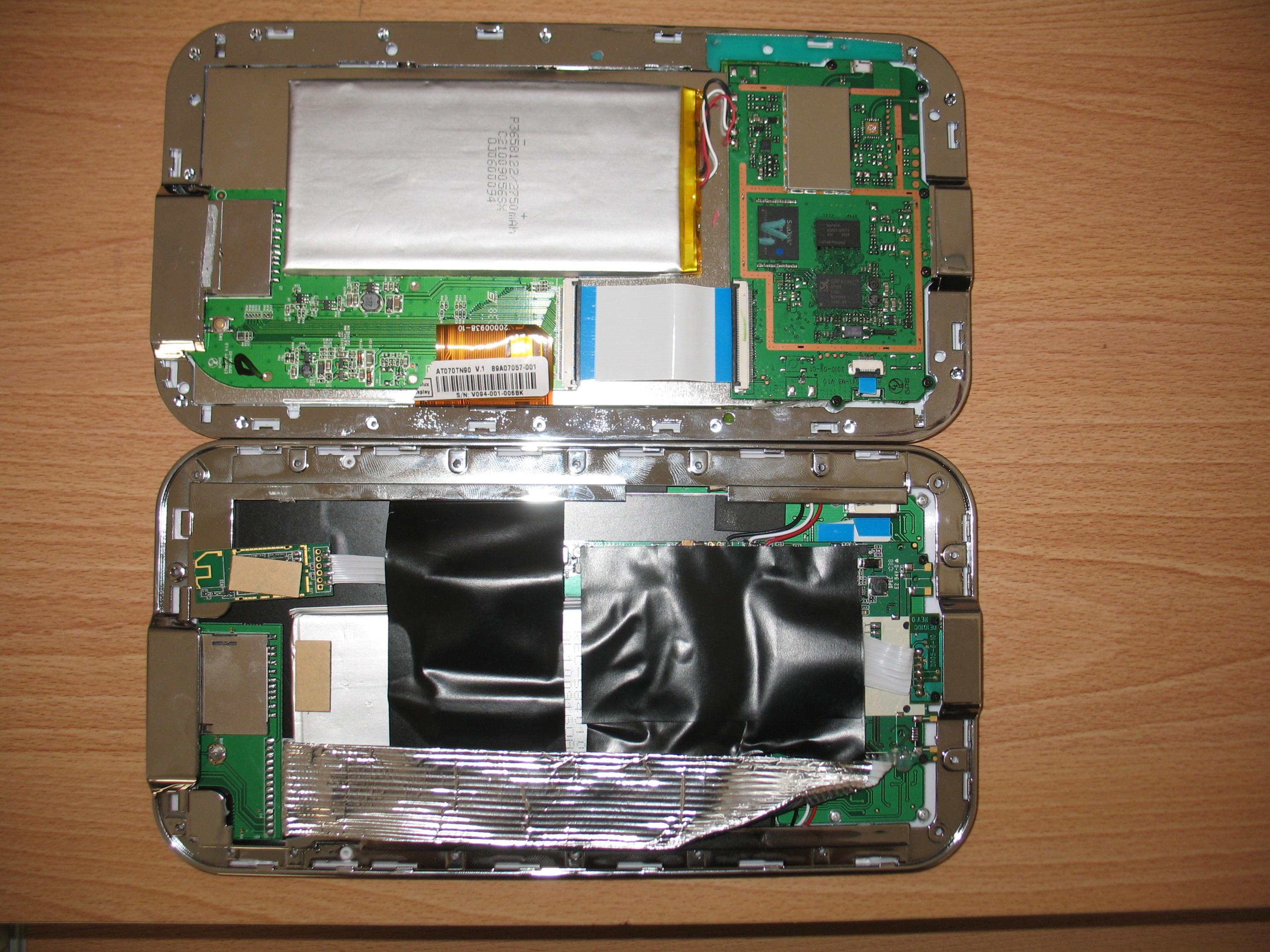I have access to both versions and took one of each apart. The new version has a much "cleaner" build. Supposedly it also has a built in 2G sd card that has 1G unused though it only allows access to 256MB. I was unable to identify anything as an sd card, but that doesn't count for much. (BTW, they appear to have different batteries judging by the printing on them.) The first photo is the new version with the back beside it. The next three are of a pcb board directly under the board with the usb and power plug on it. I don't know what it is but it says "GPS" on it. The last two are of the two different versions side-by-side. I couldn't get the silver strip off of the new version so that is as far into it as I got. |