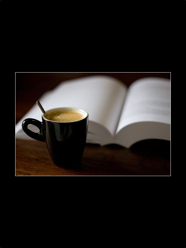 Since I typically enjoy drinking coffee while reading a book, I used Google Images to look for "book coffee" or something similar and one of the pictures that came up, I threw in Pixelator to more or less frame it. It looks very nice in B/W on my PRS-650. |