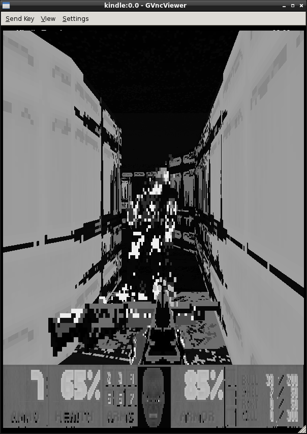 -noxdamage -ncache 20 is a helpful set of commands for viewing [root@kindle tmp]# SDL_FBACCEL=0 SDL_VIDEODRIVER=fbcon\ SDL_DEBUG=1 SDL_MOUSE_DEVICE=/dev/input/event4\ SDL_JOYSTICK_DEVICE=/dev/input/event3 prboom \ -width 592 -height 780 -nosound \ -file /mnt/us/usr/share/games/doom/prboom.wad Also now using /usr/bin/lipc-set-prop -i -- com.lab126.volumd useUsbForNetwork 1 and /usr/bin/lipc-set-prop -i -- com.lab126.volumd useUsbForNetwork 0 to just get the job done via usb. "Overally" much faster refresh, finally I can see the game "coming to life" on the device. |
