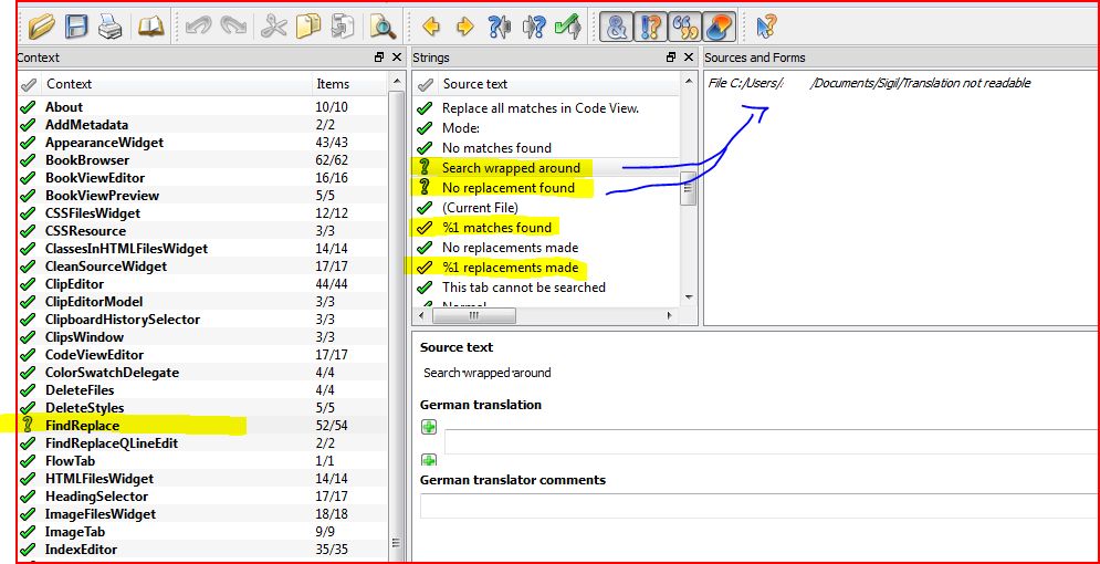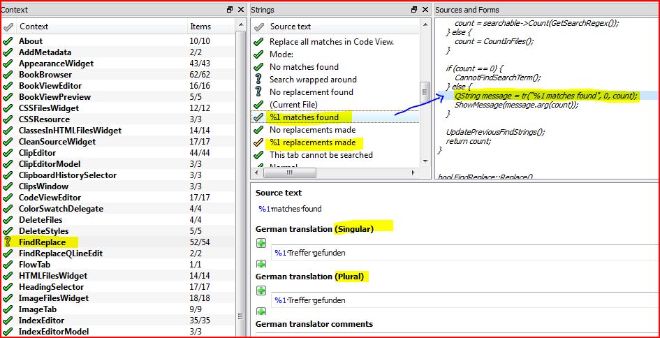 Thanks for updating the template. We did an update in Transiflex and in addition the new member penZig did a lot improvements and corrections in the actual translation. I have 4 translation strings in the FindReplace section that are not working. I can make a translation but 2 of them won't be updated by upload and two have a problem with parameter for Singular / Plural translation strings. Is it possible to take a look on that? Please take a look on attached the pictures. The first two are: "Search wrapped around" and "No replacement found". In linguist window for Sources and Forms is a message "File ... not readable" The last two are: "%1 matches found" in source code "QString message = tr("%1 matches found", 0, count);" and "%1 replacements made" in source code "QString message = tr("%1 replacements made", 0, count);" I am using the source code from version 0.6.2 and the actual ts file |