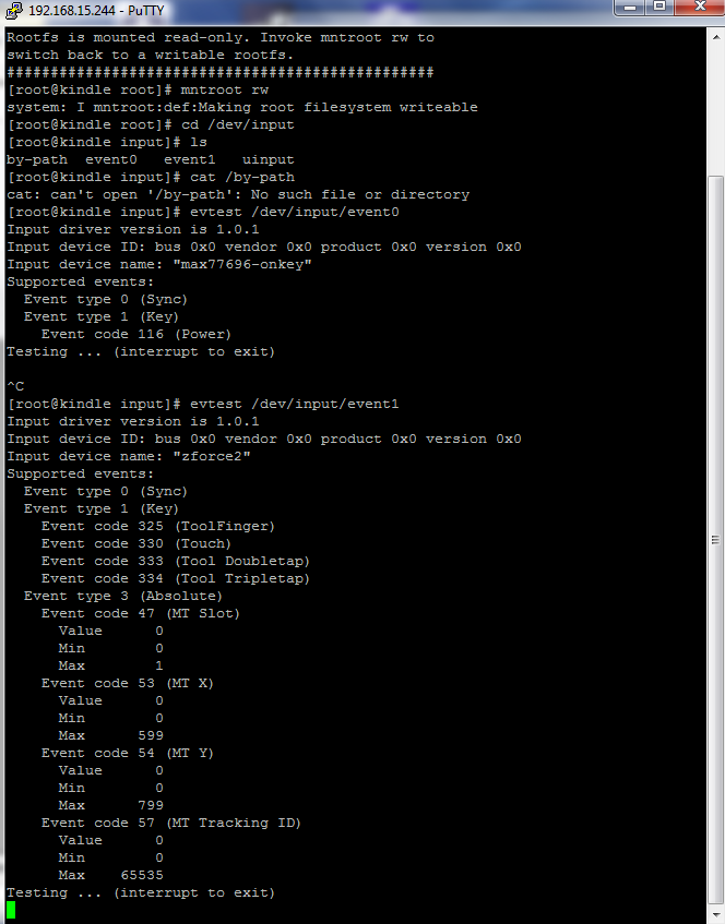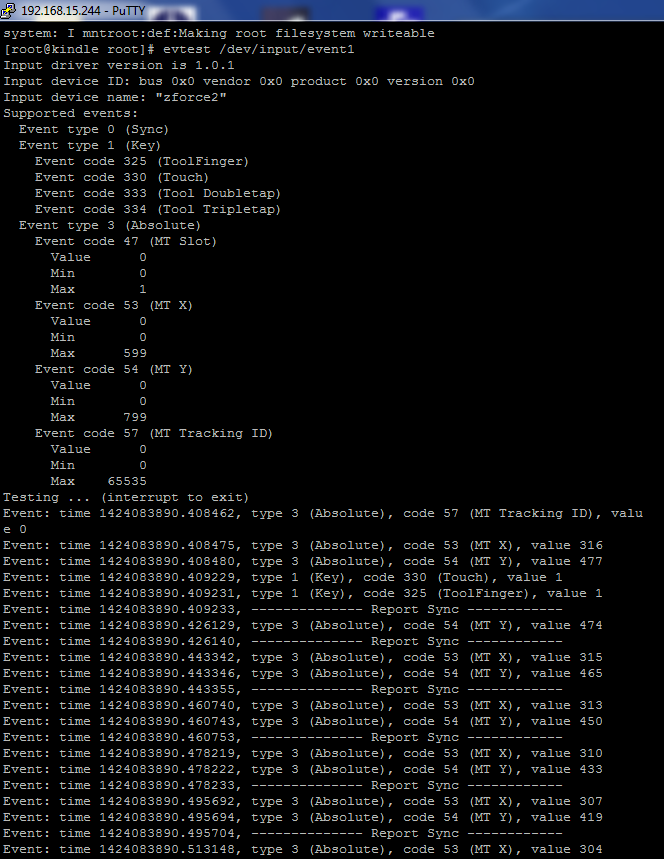 I need to know what device is used for touch screen in the KT2 KT uses /dev/input/event3 KPW uses /dev/input/event0 KPW2 uses /dev/input/event1 You can find it if you have usb network. please try evtest /dev/input/event0 .. evtest /dev/input/event3 and figure out which device responds when you touch the screen. Last edited by sergeyvl12; 02-12-2015 at 12:25 PM. |