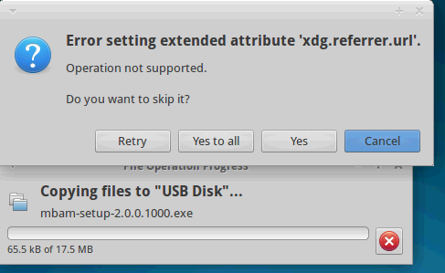 Longer answer: Extended file attributes are metadata associated with the file. They can contain virtually anything - author name, URL where the file was downloaded from, a hash or checksum of the file. Some programs might use that metadata (I think Dropbox uses them). There is a Wikipedia article on extended file attributes. Flash drives usually use a file system called FAT32, which doesn't support them, hence the message. |