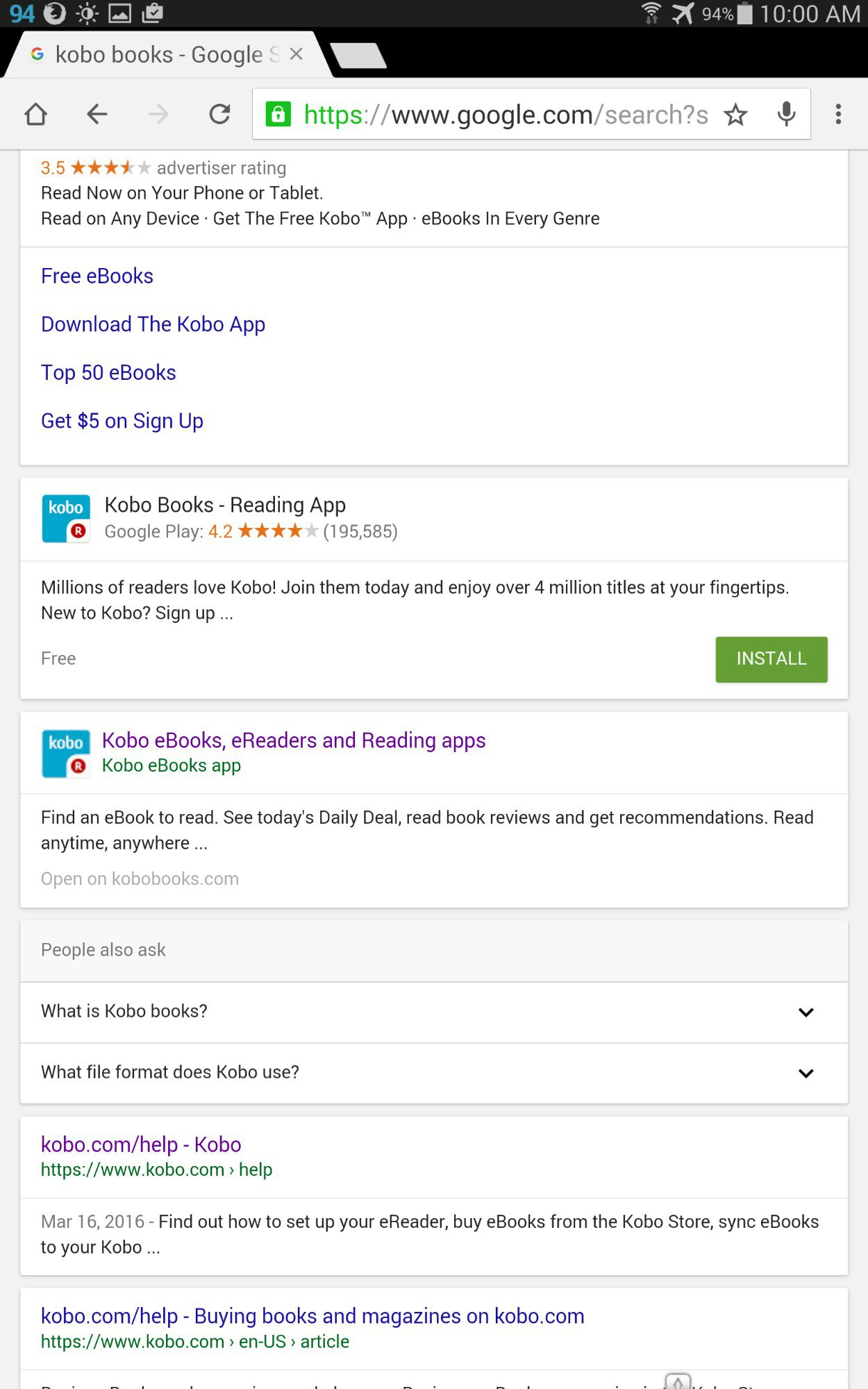 Here's a screenshot of my library using Chrome and search from Google on my tablet. It looks like the Kobo app and settings is not Chrome settings, it's Kobo settings. I tapped on "Death by a Honeybee" to try to figure out what it was and it opened it up to read. I never purchased it so who knows where it came from. I used Chrome successfully yesterday, so who knows what happened today. If I choose desktop version in Chrome before I tap the link from Google search I get the actual website. Does anybody see the same thing on a tablet?