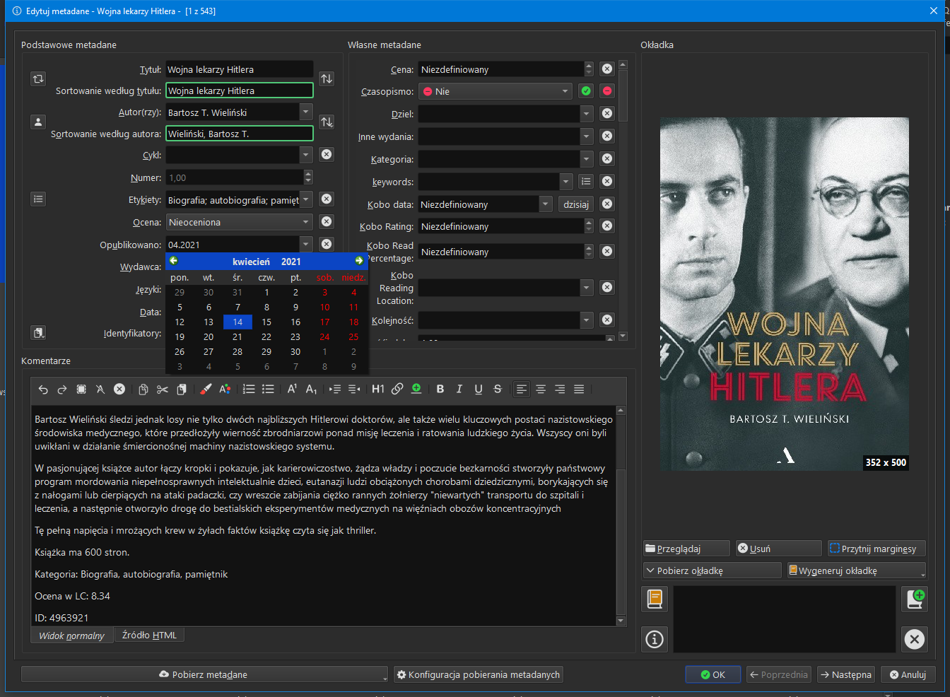 1. Leszek Błażyński - Pięści anioła. Walka o złoto Zbigniewa Pietrzykowskiego | ISBN: 9788380919211 | ID lubimyczytac: 4931546 | Data wydania: 30 czerwiec 2020 {wyświetla: sty 2020} 2. Bartosz T. Wieliński - Wojna lekarzy Hitlera | ISBN: 9788326836565 | ID lubimyczytac: 4963921 | Data wydania: 14 kwietnia 2021 {wyświetla: sty 2021} 3. Beata Szady - Wieczny początek. Warmia i Mazury |ISBN: 9788380499843 | ID lubimyczytac: 4911025 | Data wydania: 4 marca 2020 {wyświetla: sty 2020} właśnie zauważyłem coś ciekawego, a mianowicie w tytule: Olga Szmidt - Kownacka | ISBN: 9788380494053 | ID lubimyczytac: 9788380494053 dodanym do biblioteki 6 września 2021, a więc dwie a może i trzy wersje wtyczki LC wstecz też wystąpił błąd wyświetlania daty wydania zamiast "lis 2016" jest "sty 2016", więc to nie jest kwestia daty wydania wtyczki, bowiem w kolejnych dodanych do biblioteki tytułach ten błąd praktycznie nie występuje (niemalże normą stał się dopiero ok. 10 stycznia br. ) ![]() Tytuły gdzie metadane dot. daty wydania są wyświetlane poprawnie (zaznaczam to są wyjątki na ok. 30-40 przetestowanych tytułów): a) Anna Wylegała - Był dwór, nie ma dworu | ISBN: 9788381913539 | ID lubimyczytac: 4985360 | Data wydania: 10 październik 2021 {wyswietla: paź 2021} b) Hanna Faryna-Paszkiewicz - Kobusz. Jan Kobuszewski z drugiej strony sceny | ISBN: 9788327719577 | ID lubimyczytac: 4981839 | Data wydania: 15 września 2021 {wyświetla: wrz 2021} Warto nadmienić, że nie mam zainstalowanych innych wtyczek. Jedno co może się "gryźć" to fakt, że używam calibre 5.x na Windows 7, a jak wiadomo jest to trochę partyzantka, bo teoretycznie nie powinno się go używać na tak starym systemie... tylko dlaczego jedne tytuły są ok, a inne nie Teoretycznie wszystko powinno być błędne. A może to raczej wina lubimyczytac.pl