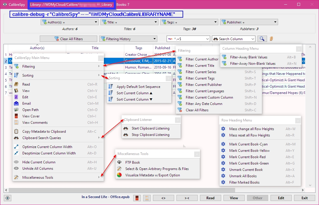 Version 1.0.30- 22 Sept 2018 Visualize Metadata with option to export the raw data to a .csv file. FTP book to a server. Full-featured 'Select & Open Arbitrary Programs and Files'. 'Clear All Filters' performance improved for large libraries.
