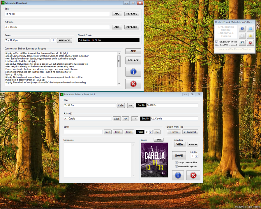 Order of usage is as follows. You drag & drop the metadata.opf file onto the small floating dropbox at top right (first screenshot). The 'Metadata Editor' window (lower center) then opens and displays the relevant content. Click the FETCH metadata button and the 'Metadata Download' window opens after fetching the metadata from the web, and displays relevant content. Clicking on ADD or REPLACE buttons updates the same fields on the 'Metadata Editor' window. Click the FETCH cover button and the 'Compare Cover Images' window (second screenshot) opens after fetching the cover from the web. I now have the basis for adding that same ability to my listing program for Synopsis (Blurb, etc) that I mentioned earlier in this topic. Last edited by Timboli; 05-19-2019 at 08:05 AM. |