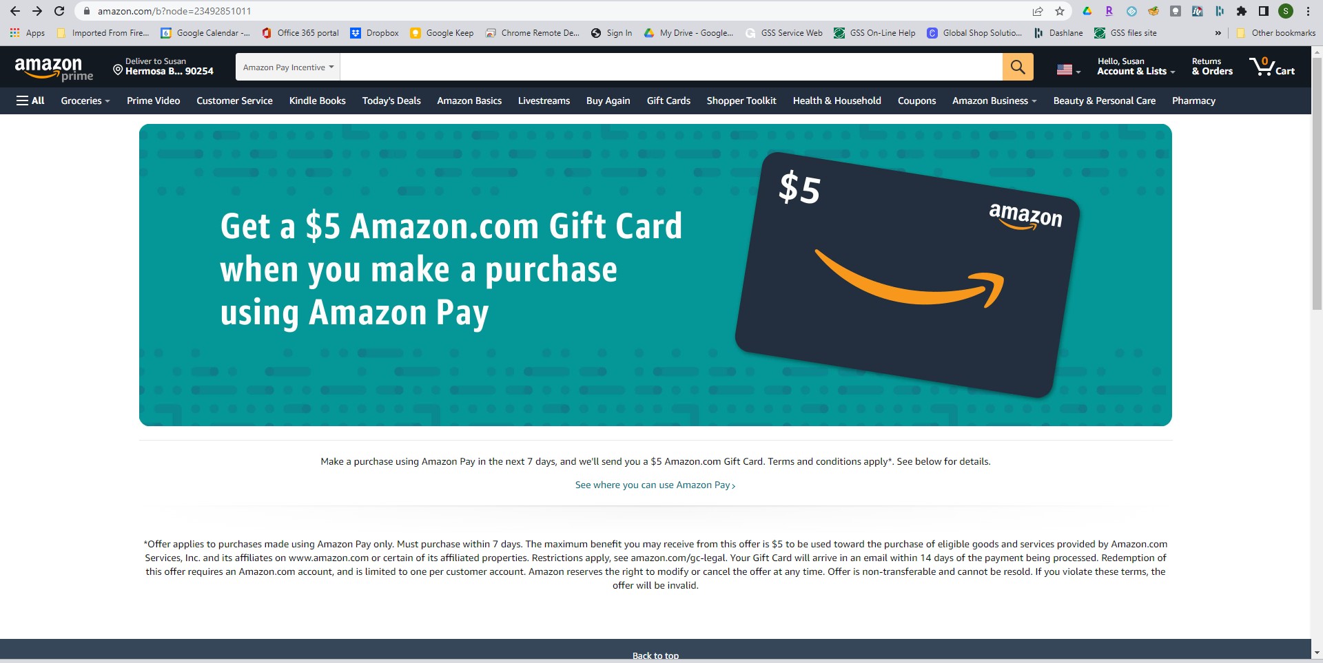 .I had a "Use Amazon Pay, get a $5 Amazon Credit" banner ad pop up just now, and when I clicked through, it took me to this page: https://www.amazon.com/b?node=23492851011 And on that page, there's a link to a list of places you can use Amazon Pay. I didn't see a button to push to activate, which is a bit odd. I'm attaching a screenshot as a thumbnail. Oh, and you have to make your purchase within 7 days... As usual with Amazon offers, YMMV - their algorithms may make sense to them, but rarely to the rest of us .